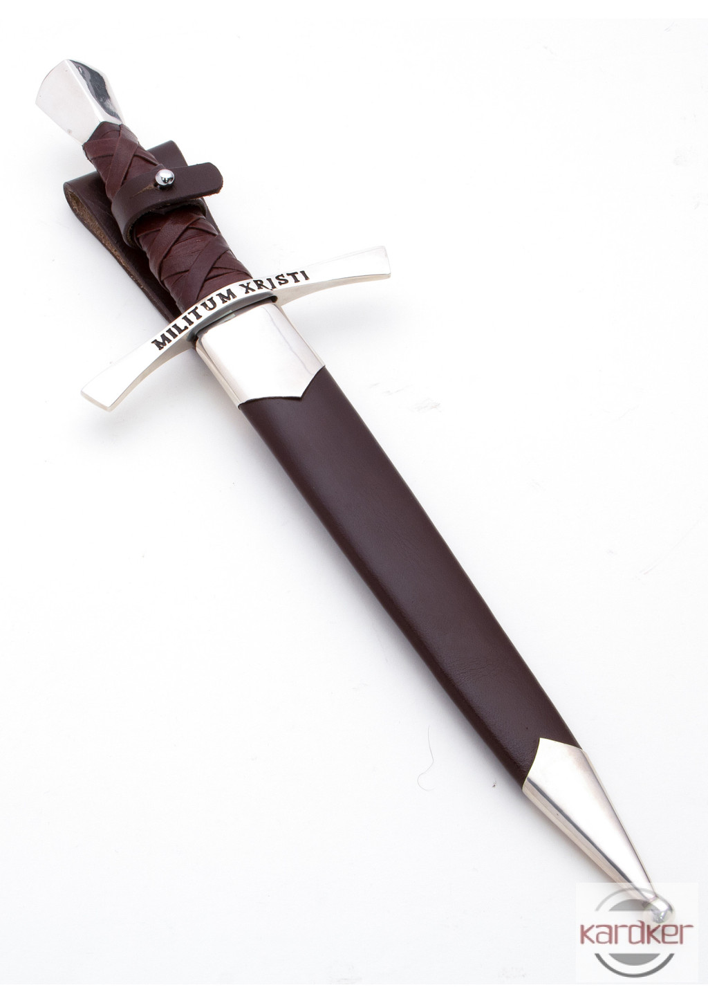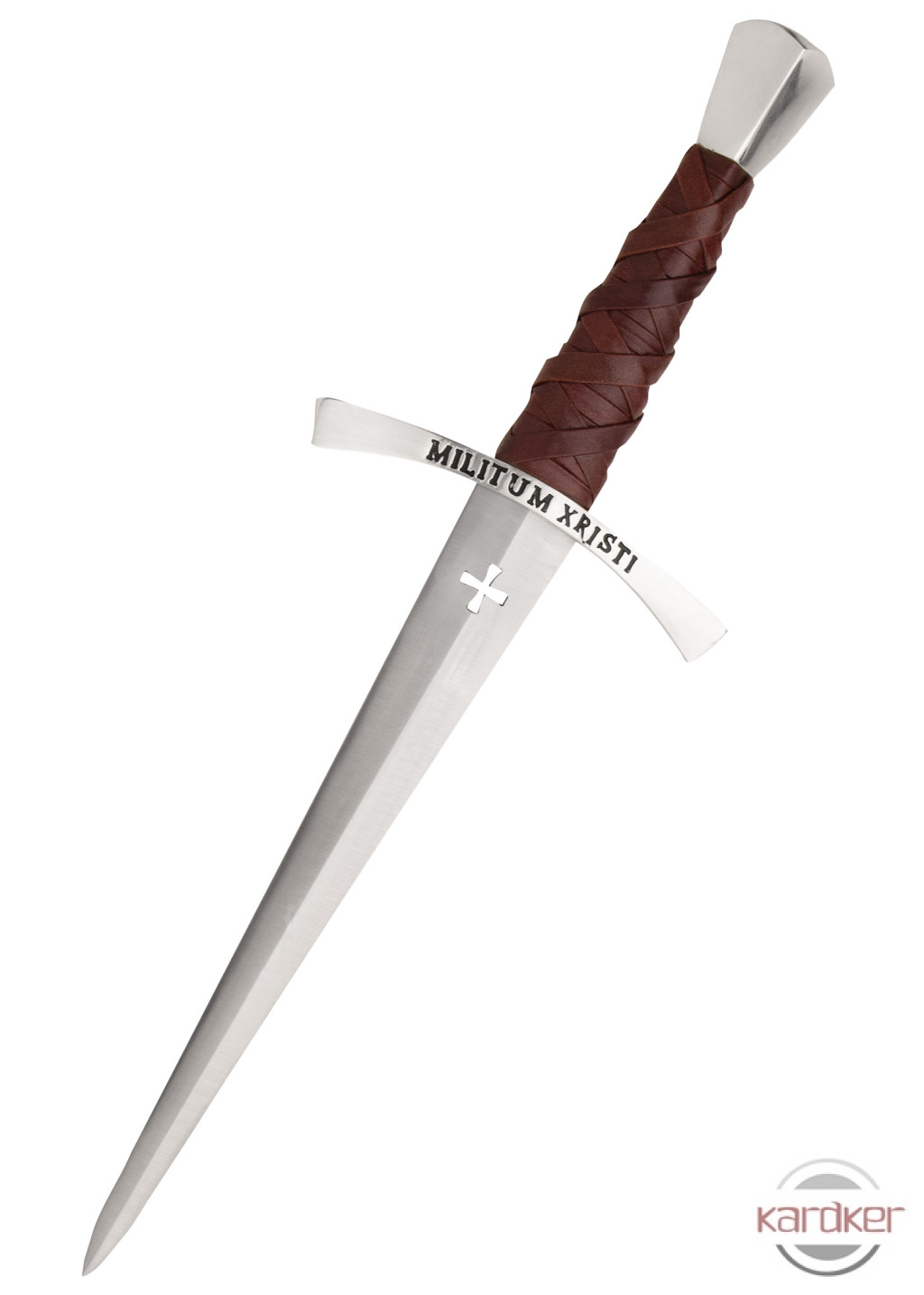 A szénacél penge gyémánt formájú keresztmetszettel és egy lyuggatott templomos kereszttel rendelkezik a ricasso-n. A tőrhöz egyedi készítésű, hozzáillő, kiváló minőségű bőrből készült tok tartozik, övhurokkal és patenttal a fegyver biztonsága érdekében. Ez a tőr valóban kötelező darab minden történelem rajongó számára.